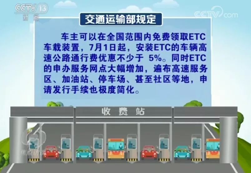 交通运输部规定,车主可以在全国范围内免费领取ETC车载装置,7月1日起,安装ETC的车辆高速公路通行费优惠不少于5%!